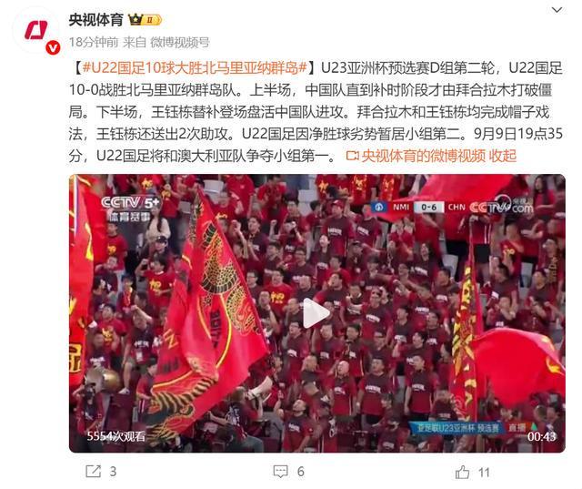 来源:@央视体育U23亚洲杯预选赛D组第二轮,U22国足10-0战胜北马里亚纳群岛队。上半场,中国队直到补时阶段才由拜合拉木打破僵局。下半场,王钰栋替补登场盘活中国队进攻。拜合拉木和王钰栋均完成帽子戏法,王钰栋还送出2次助攻。U22国足因净胜球劣势暂居小组第二。9月9日19点35分,U22国足将和澳大利亚队争夺小组第一。...